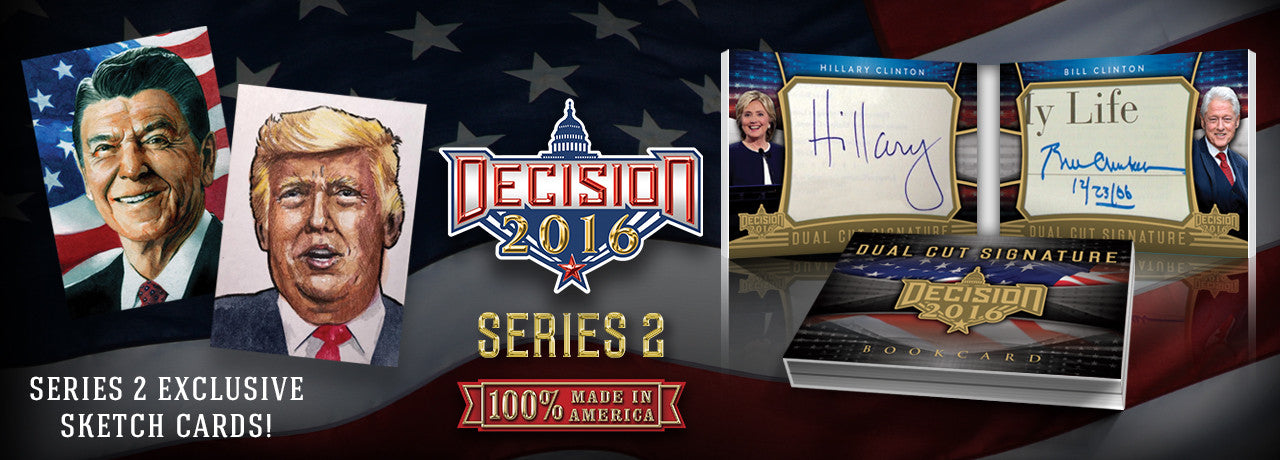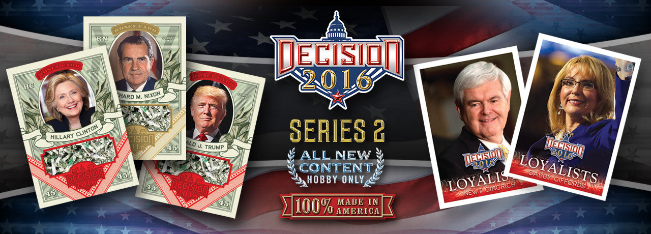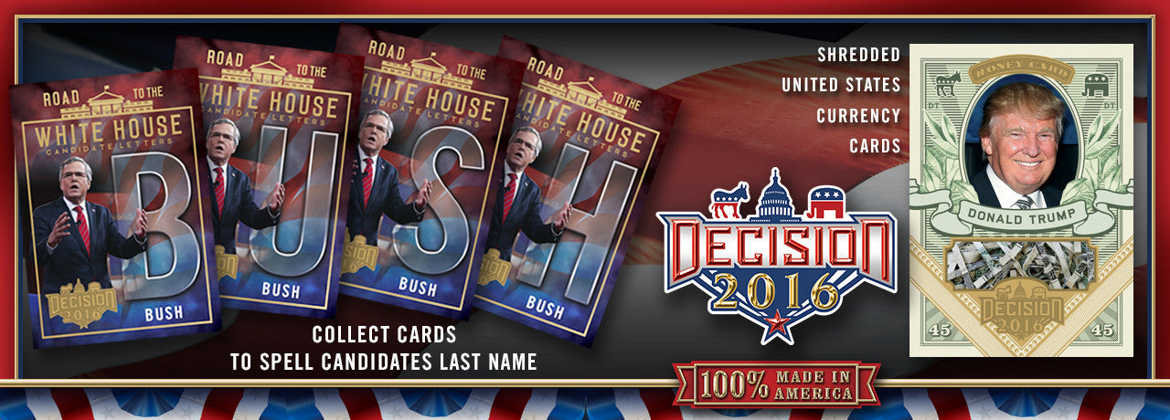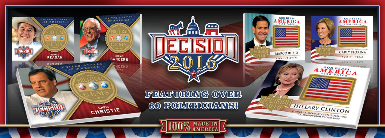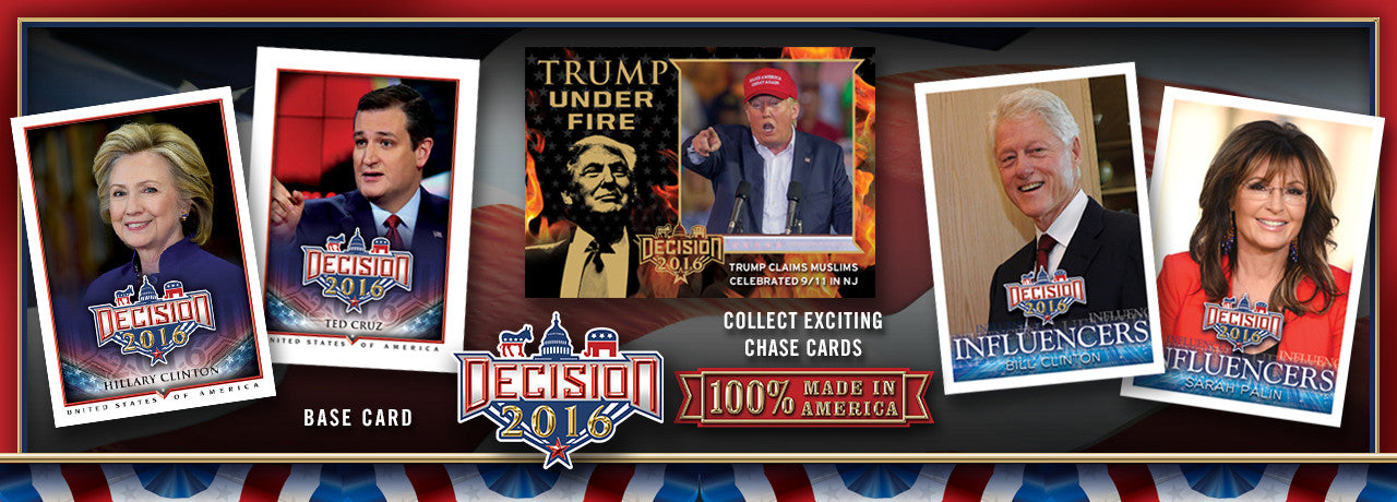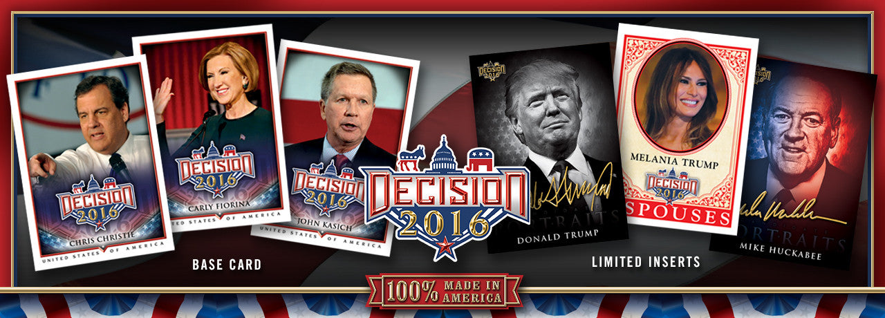 On November 8, 2016, American voters will cast their votes to elect the next President of the United States of America. The road to that date has been, and will be, filled with unforgettable moments, lively debates and a vast array of candidates and campaigns. Whether you are a first time voter, looking for information on the candidates as your state's caucus or primary draws near, or a political enthusiast, the Decision 2016 Trading Cards will memorialize this election in a high quality, fact filled collection. Special collectable sets will include: Debate Moments, Key Influencers, Final Candidates, and more!